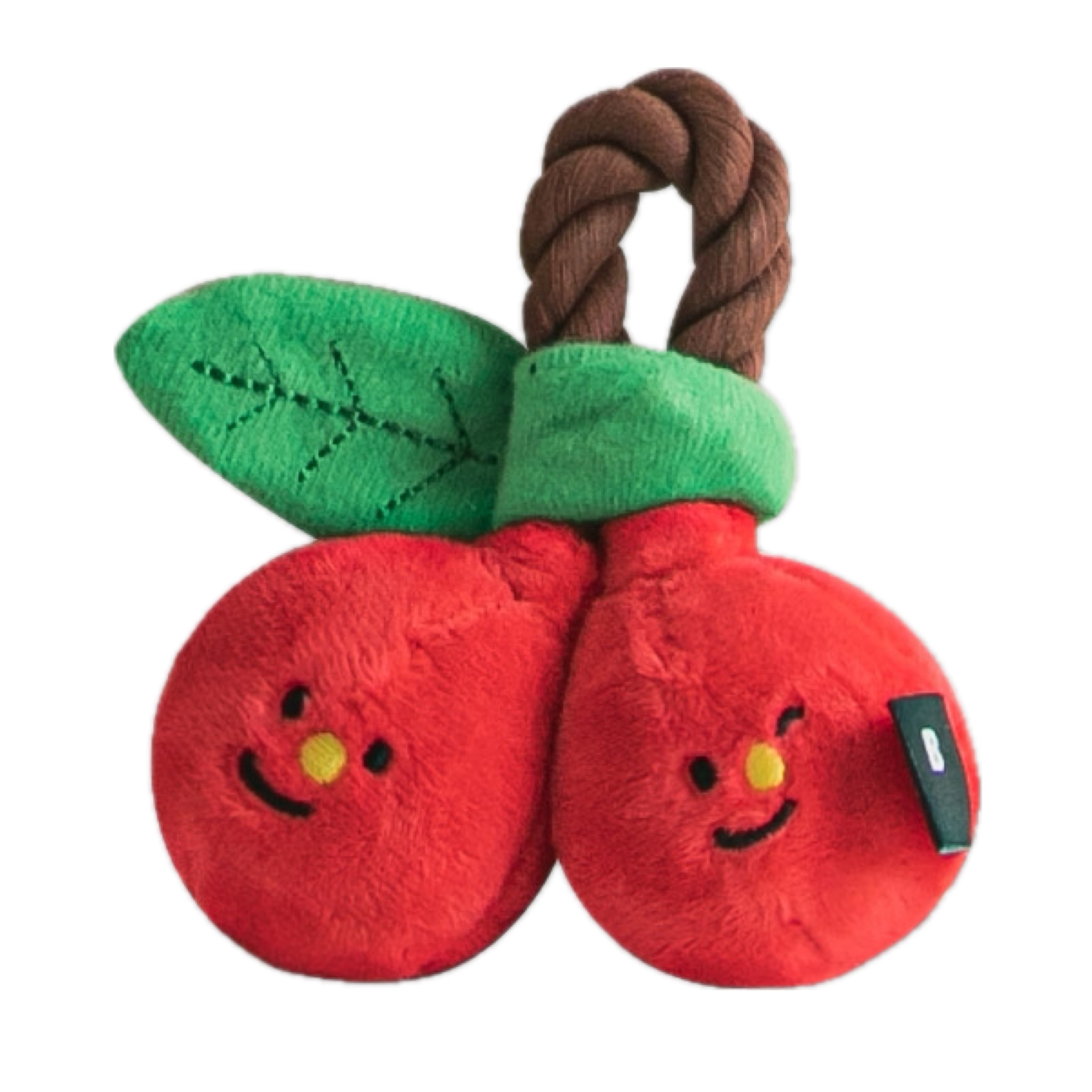 さくらんぼの実の部分はピーピー音が鳴り、葉っぱの部分はカシャカシャ音が鳴ります。さらに、葉っぱを外すと茎の部分がロープになっているので、引っ張りっこ遊びも楽しめます。チャーミングな表情のさくらんぼ2粒もポイントです!
