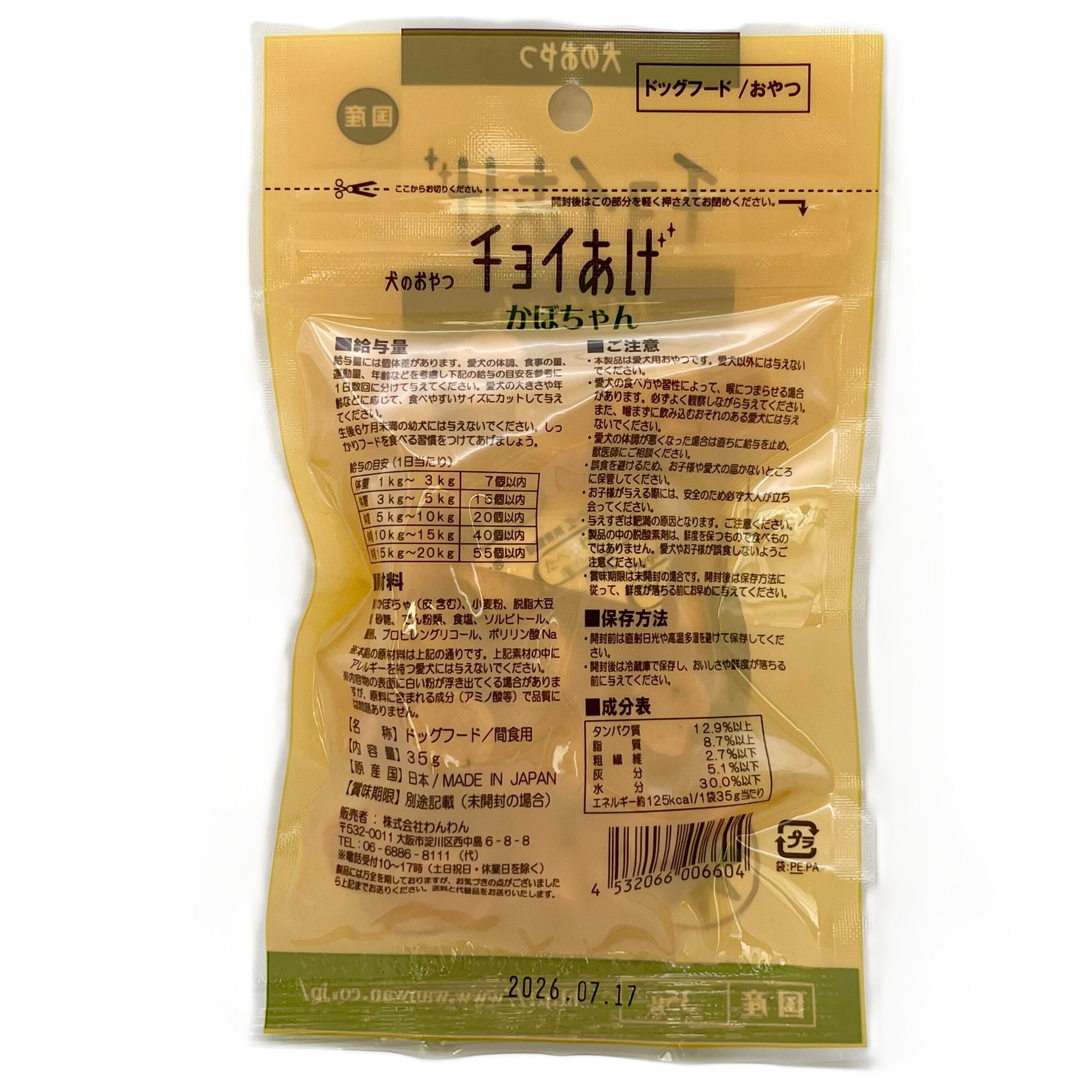 鶏肉、かぼちゃ(皮 含む)、小麦粉、脱脂大豆粉末、砂糖、でん粉類、食塩、ソルビトール、膨張剤、プロピレングリコール、ポリリン酸Na